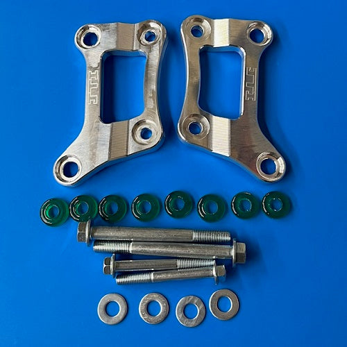 Our Front Engine Mounts are CNC machined from 6061-T6 billet aluminum, making them strong and light weight. The rubber isolated version allows a small amount of movement for reduced vibration while maintaining strength and integrity. Our proprietary bushings are manufactured in-house to produce the specific hardness and function for the ultimate in performance. Raw machined finish. Don't forget to check out our rear mounts as well. We also offer a solid version of the front mounts (see listing).
